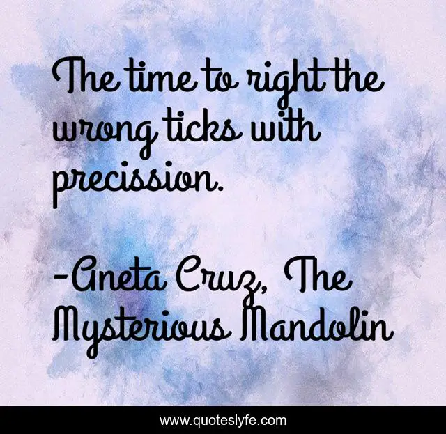 This page presents the quote "The time to right the wrong ticks with precission.". Author of this quote is Aneta Cruz, The Mysterious Mandolin. This quote is about inspirational-life, attitude-toward-life, righteousness, patience, time,.
