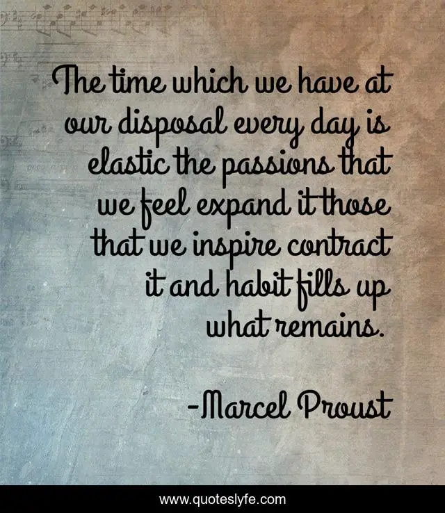 This page presents the quote "The time which we have at our disposal every day is elastic the passions that we feel expand it those that we inspire contract it and habit fills up what remains.". Author of this quote is Marcel Proust. This quote is about day, one,.