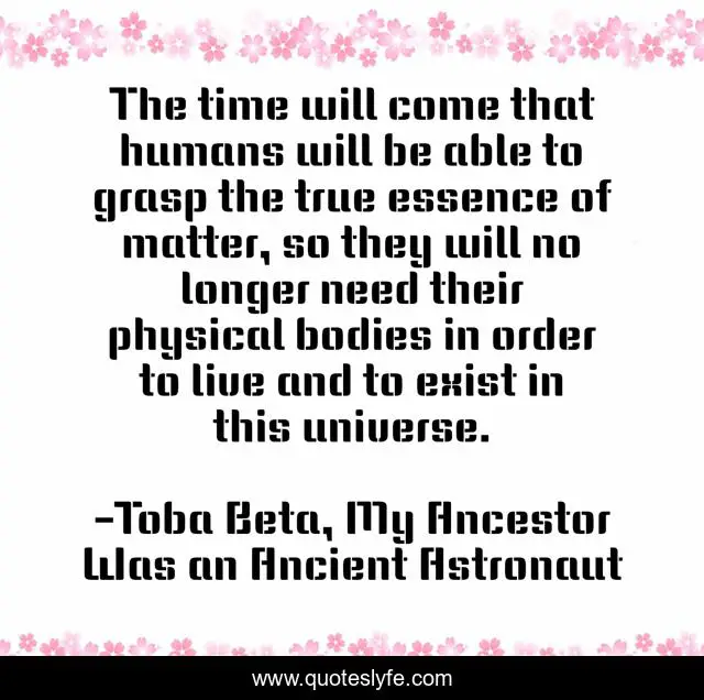 This page presents the quote "The time will come that humans will be able to grasp the true essence of matter, so they will no longer need their physical bodies in order to live and to exist in this universe.". Author of this quote is Toba Beta, My Ancestor Was an Ancient Astronaut. This quote is about body, forever, universe, eternal, formless, live, exist, spirit,.