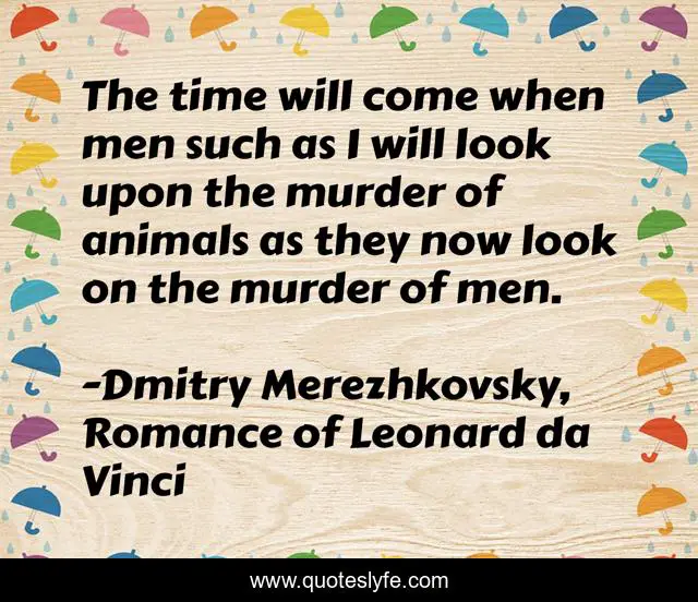 This page presents the quote "The time will come when men such as I will look upon the murder of animals as they now look on the murder of men.". Author of this quote is Dmitry Merezhkovsky, Romance of Leonard da Vinci. This quote is about murder, animals, animal-rights,.