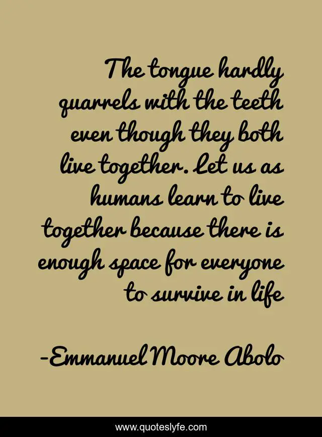 This page presents the quote "The tongue hardly quarrels with the teeth even though they both live together. Let us as humans learn to live together because there is enough space for everyone to survive in life". Author of this quote is Emmanuel Moore Abolo. This quote is about life, space, live, teeth, tongue, quarrel,.
