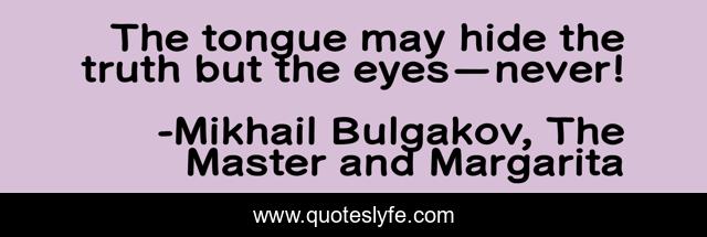 This page presents the quote "The tongue may hide the truth but the eyes—never!". Author of this quote is Mikhail Bulgakov, The Master and Margarita. This quote is about lies, eyes, tongue, truth,.