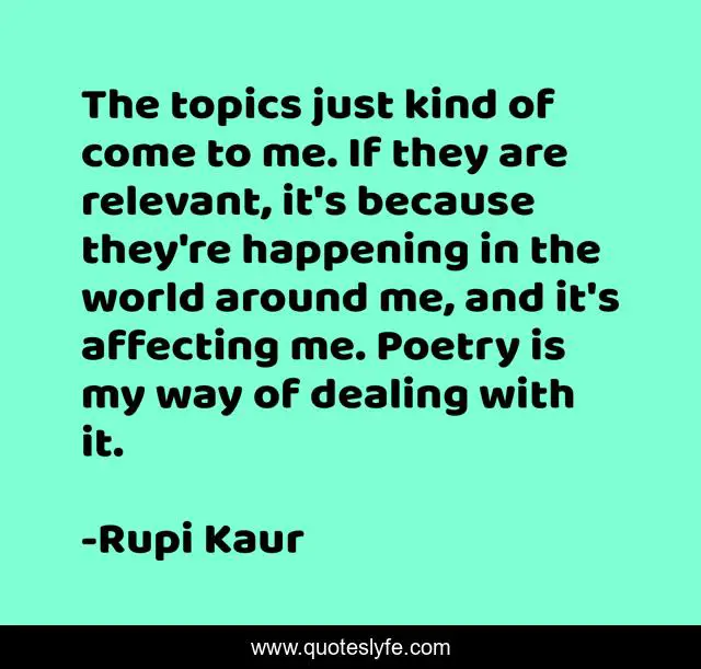 This page presents the quote "The topics just kind of come to me. If they are relevant, it's because they're happening in the world around me, and it's affecting me. Poetry is my way of dealing with it.". Author of this quote is Rupi Kaur. This quote is about me, world, dealing,.