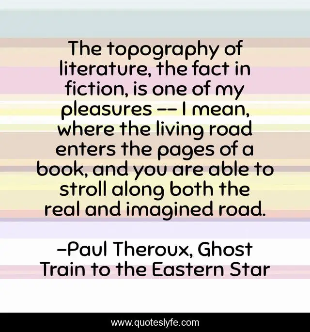 This page presents the quote "The topography of literature, the fact in fiction, is one of my pleasures -- I mean, where the living road enters the pages of a book, and you are able to stroll along both the real and imagined road.". Author of this quote is Paul Theroux, Ghost Train to the Eastern Star. This quote is about topography, place, literature, geography,.