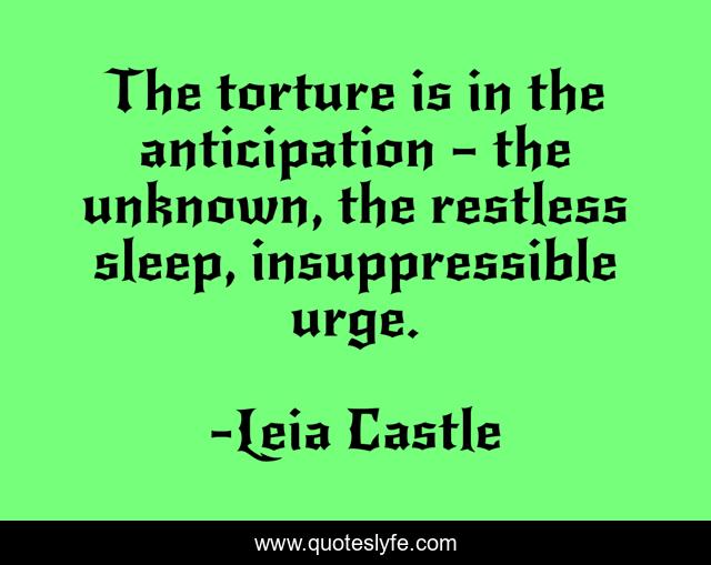 This page presents the quote "The torture is in the anticipation – the unknown, the restless sleep, insuppressible urge.". Author of this quote is Leia Castle. This quote is about romance, erotica-romance, erotica, stepdad, erotica-romance-love,.