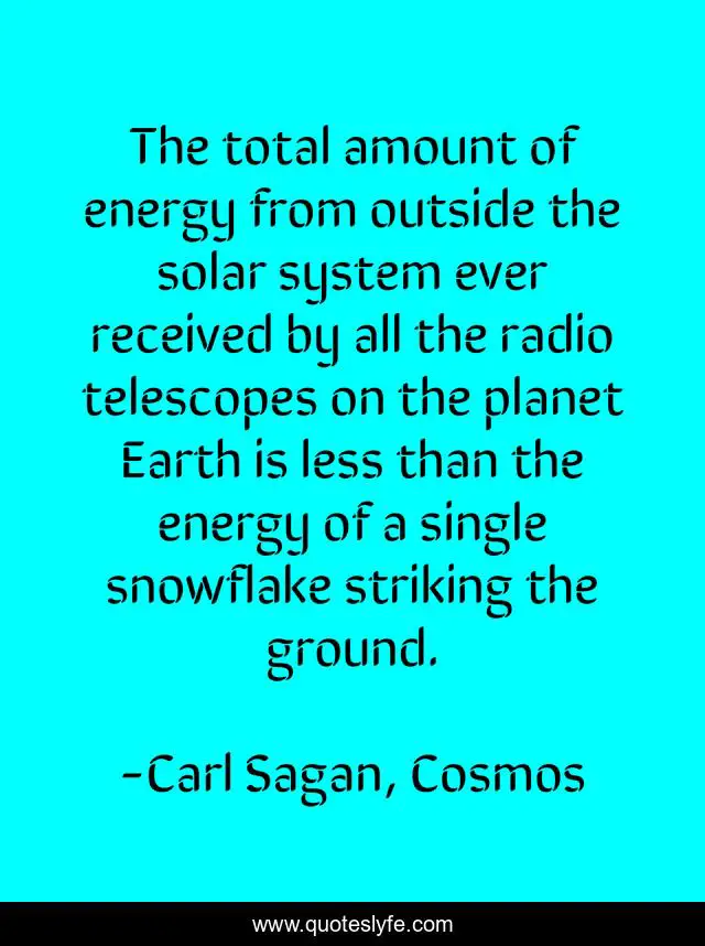 This page presents the quote "The total amount of energy from outside the solar system ever received by all the radio telescopes on the planet Earth is less than the energy of a single snowflake striking the ground.". Author of this quote is Carl Sagan, Cosmos. This quote is about cosmos, cosmology, radio-telescopes, space,.