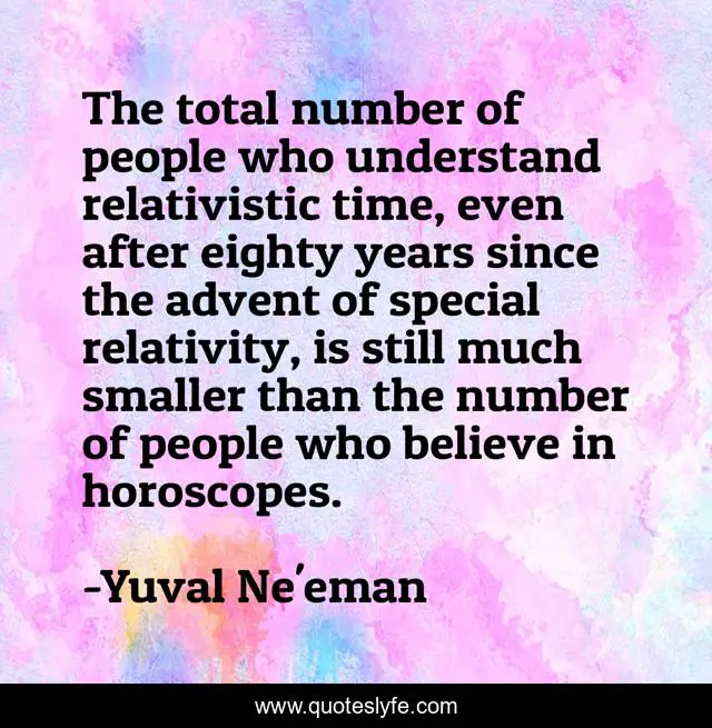 This page presents the quote "The total number of people who understand relativistic time, even after eighty years since the advent of special relativity, is still much smaller than the number of people who believe in horoscopes.". Author of this quote is Yuval Ne'eman. This quote is about gravity, special-relativity, general-relativity, science, relativity, ignorance, sad, einstein, albert-einstein,.