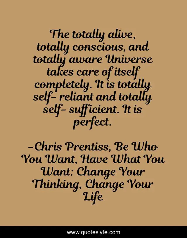 This page presents the quote "The totally alive, totally conscious, and totally aware Universe takes care of itself completely. It is totally self- reliant and totally self- sufficient. It is perfect.". Author of this quote is Chris Prentiss, Be Who You Want, Have What You Want: Change Your Thinking, Change Your Life. This quote is about perfect, life, universe, chris-prentiss, quotes, inspirational, enthusiasm, metaphysics, inspiration,.