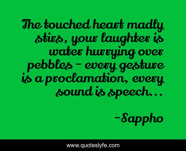 This page presents the quote "The touched heart madly stirs, your laughter is water hurrying over pebbles - every gesture is a proclamation, every sound is speech...". Author of this quote is Sappho. This quote is about poem, love, jealousy, poetry, lust, greek-poetry, affection,.