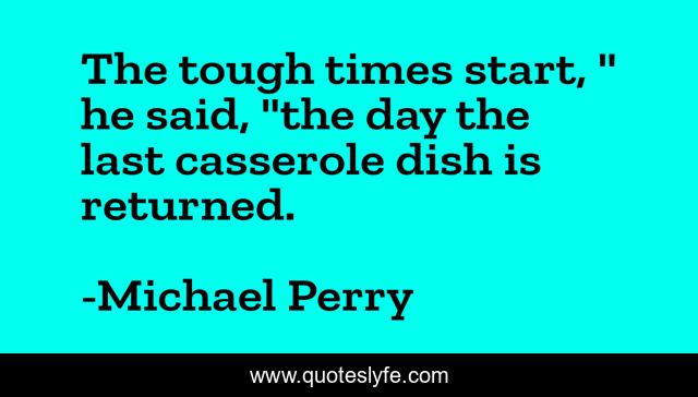 This page presents the quote "The tough times start, " he said, "the day the last casserole dish is returned.". Author of this quote is Michael Perry. .