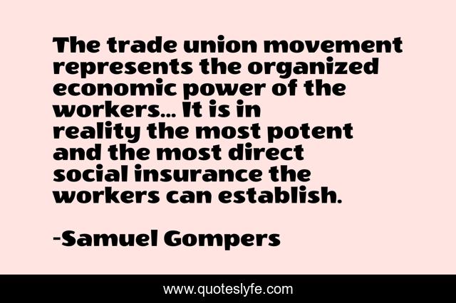 This page presents the quote "The trade union movement represents the organized economic power of the workers... It is in reality the most potent and the most direct social insurance the workers can establish.". Author of this quote is Samuel Gompers. This quote is about economic, insurance, reality,.