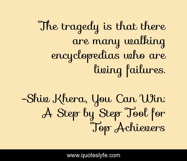 This page presents the quote "The tragedy is that there are many walking encyclopedias who are living failures.". Author of this quote is Shiv Khera, You Can Win: A Step by Step Tool for Top Achievers. This quote is about ability, success, skills, failure, education, knowledge,.