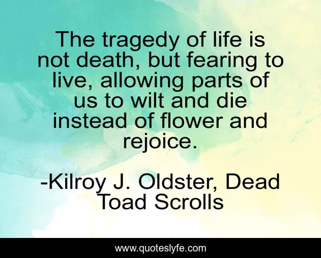 This page presents the quote "The tragedy of life is not death, but fearing to live, allowing parts of us to wilt and die instead of flower and rejoice.". Author of this quote is Kilroy J. Oldster, Dead Toad Scrolls. This quote is about death, death-and-dying, tragedy,.