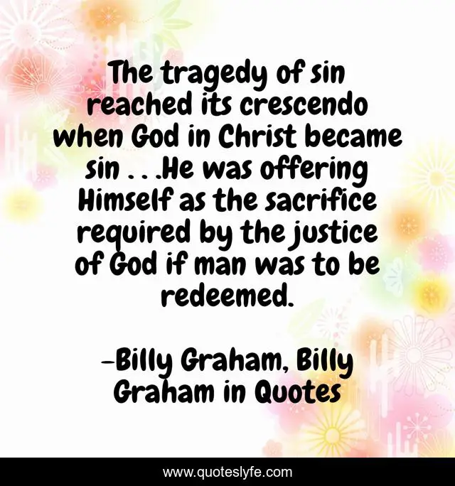 This page presents the quote "The tragedy of sin reached its crescendo when God in Christ became sin . . .He was offering Himself as the sacrifice required by the justice of God if man was to be redeemed.". Author of this quote is Billy Graham, Billy Graham in Quotes. This quote is about christ, redeemed, justice, god, sacrifice, billy-graham, sin,.