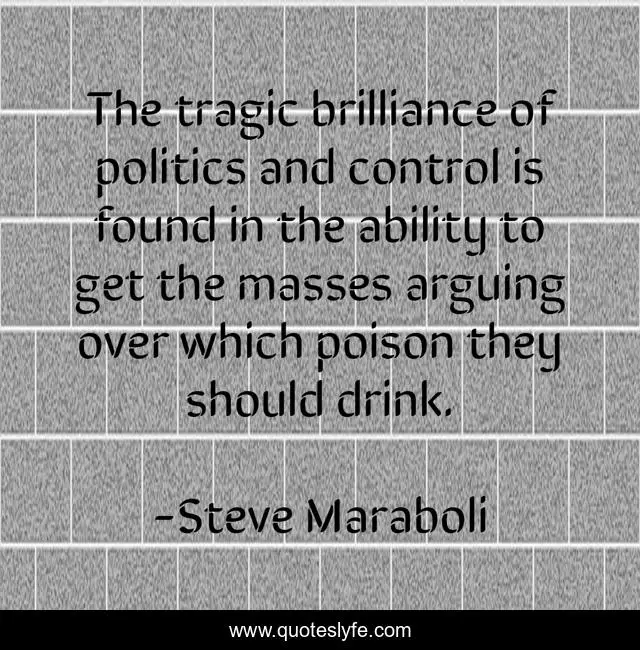 This page presents the quote "The tragic brilliance of politics and control is found in the ability to get the masses arguing over which poison they should drink.". Author of this quote is Steve Maraboli. This quote is about arguing, politics, masses, poison,.