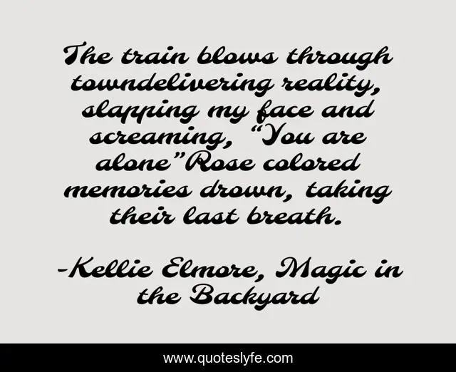 This page presents the quote "The train blows through towndelivering reality, slapping my face and screaming, “You are alone”Rose colored memories drown, taking their last breath.". Author of this quote is Kellie Elmore, Magic in the Backyard. This quote is about loss, death, memories, loneliness, grief, sadness, grieving, depression,.