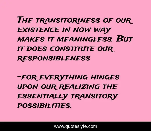 "for everything hinges upon our realizing the essentially transitory possibilities. Quotes." Quoteslyfe.com, 2025. Fri. 05 Dec. 2025. <https://www.quoteslyfe.com/quote/The-transitoriness-of-our-existence-in-now-103265>.