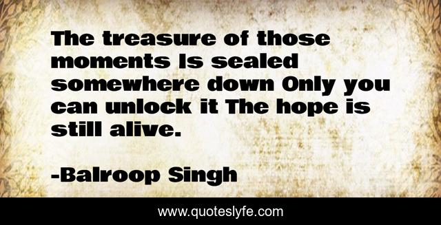 This page presents the quote "The treasure of those moments Is sealed somewhere down Only you can unlock it The hope is still alive.". Author of this quote is Balroop Singh. This quote is about moments, treasure, hope,.