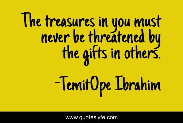 This page presents the quote "The treasures in you must never be threatened by the gifts in others.". Author of this quote is TemitOpe Ibrahim. This quote is about confidence, inspirational, positive, motivational, life, wisdom, gifts, treasures, optimistic,.