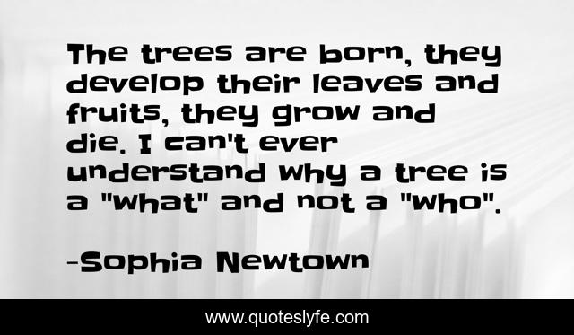 This page presents the quote "The trees are born, they develop their leaves and fruits, they grow and die. I can't ever understand why a tree is a "what" and not a "who".". Author of this quote is Sophia Newtown. This quote is about environment, earth, trees,.