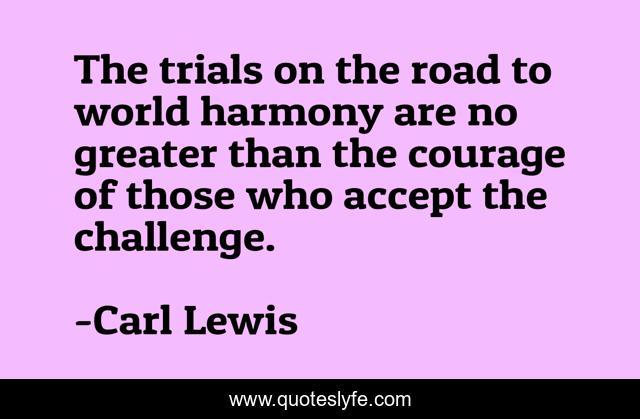 This page presents the quote "The trials on the road to world harmony are no greater than the courage of those who accept the challenge.". Author of this quote is Carl Lewis. This quote is about world, challenge, road,.