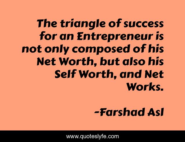 This page presents the quote "The triangle of success for an Entrepreneur is not only composed of his Net Worth, but also his Self Worth, and Net Works.". Author of this quote is Farshad Asl. This quote is about entrepreneur, net-worth, net-work, success, self-worth,.