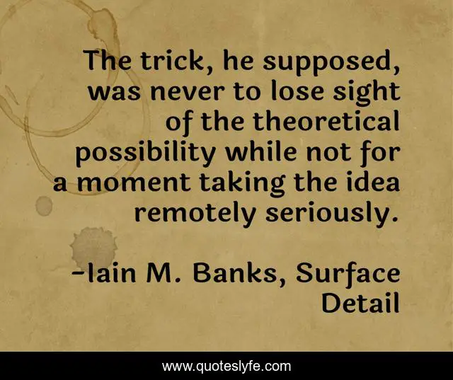 This page presents the quote "The trick, he supposed, was never to lose sight of the theoretical possibility while not for a moment taking the idea remotely seriously.". Author of this quote is Iain M. Banks, Surface Detail. This quote is about pragmatism, theory, reality,.