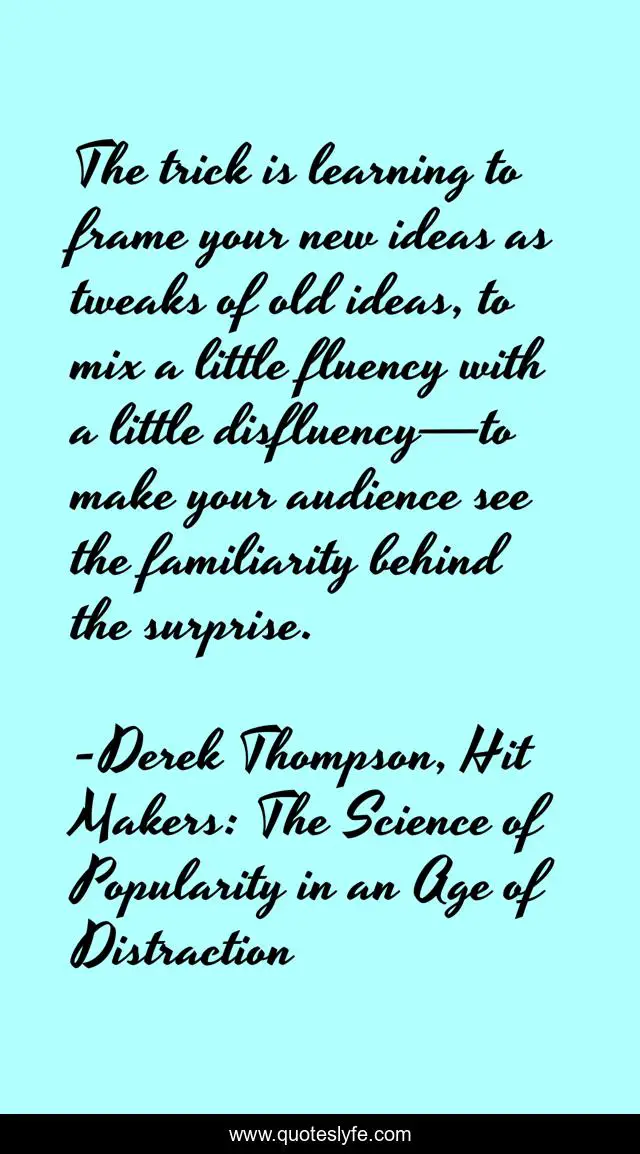 This page presents the quote "The trick is learning to frame your new ideas as tweaks of old ideas, to mix a little fluency with a little disfluency—to make your audience see the familiarity behind the surprise.". Author of this quote is Derek Thompson, Hit Makers: The Science of Popularity in an Age of Distraction. This quote is about advice, popularity, ideas, business,.