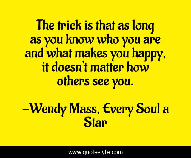 This page presents the quote "The trick is that as long as you know who you are and what makes you happy, it doesn't matter how others see you.". Author of this quote is Wendy Mass, Every Soul a Star. This quote is about see, others,.
