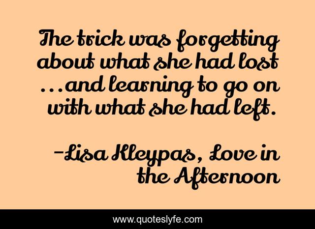 This page presents the quote "The trick was forgetting about what she had lost ...and learning to go on with what she had left.". Author of this quote is Lisa Kleypas, Love in the Afternoon. This quote is about live, forget, learn,.