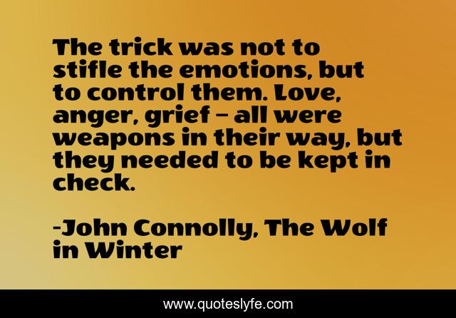 This page presents the quote "The trick was not to stifle the emotions, but to control them. Love, anger, grief – all were weapons in their way, but they needed to be kept in check.". Author of this quote is John Connolly, The Wolf in Winter. This quote is about control, emotions,.