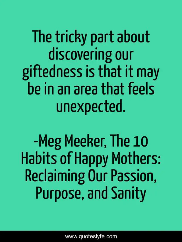 "Meg Meeker, The 10 Habits of Happy Mothers: Reclaiming Our Passion, Purpose, and Sanity Quotes." Quoteslyfe.com, 2025. Sat. 06 Dec. 2025. <https://www.quoteslyfe.com/quote/The-tricky-part-about-discovering-our-giftedness-14564>.