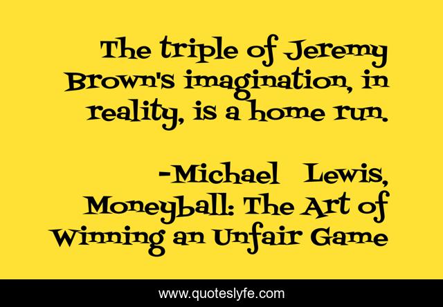 This page presents the quote "The triple of Jeremy Brown's imagination, in reality, is a home run.". Author of this quote is Michael Lewis, Moneyball: The Art of Winning an Unfair Game. This quote is about imagination, jeremy-brown, reality,.