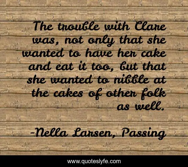 This page presents the quote "The trouble with Clare was, not only that she wanted to have her cake and eat it too, but that she wanted to nibble at the cakes of other folk as well.". Author of this quote is Nella Larsen, Passing. .