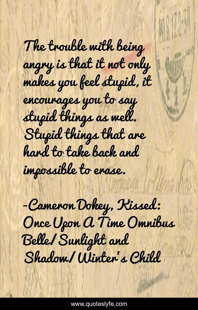 This page presents the quote "The trouble with being angry is that it not only makes you feel stupid, it encourages you to say stupid things as well. Stupid things that are hard to take back and impossible to erase.". Author of this quote is Cameron Dokey, Kissed: Once Upon A Time Omnibus Belle/Sunlight and Shadow/Winter's Child. This quote is about anger, stupid-things,.