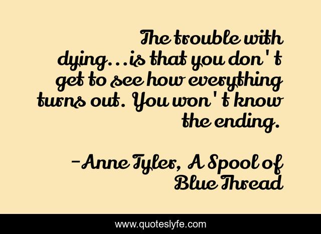 This page presents the quote "The trouble with dying...is that you don't get to see how everything turns out. You won't know the ending.". Author of this quote is Anne Tyler, A Spool of Blue Thread. This quote is about death, dying,.