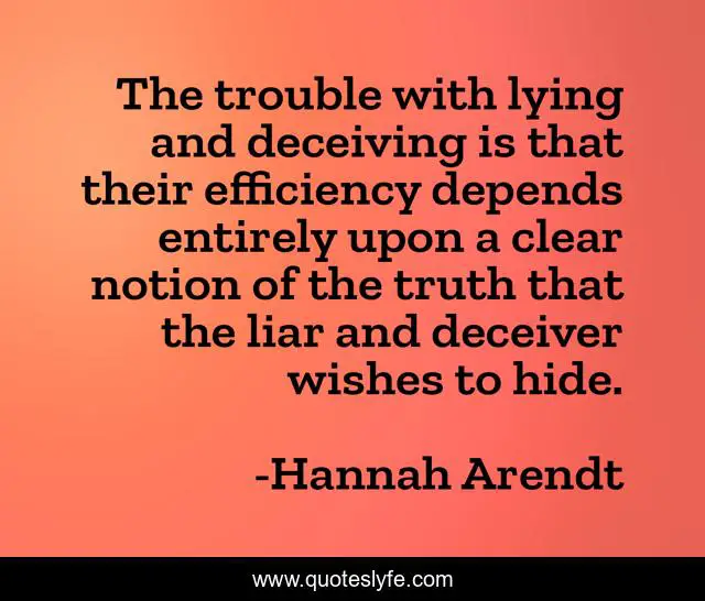 This page presents the quote "The trouble with lying and deceiving is that their efficiency depends entirely upon a clear notion of the truth that the liar and deceiver wishes to hide.". Author of this quote is Hannah Arendt. .