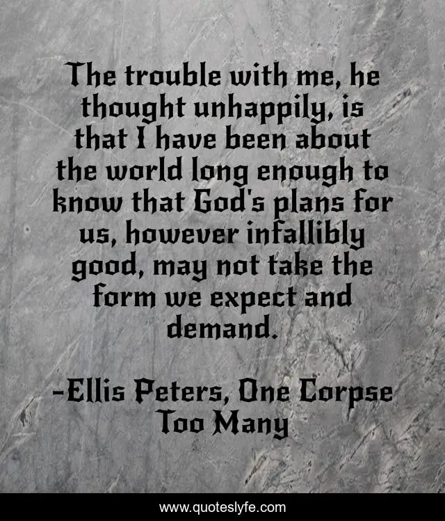 This page presents the quote "The trouble with me, he thought unhappily, is that I have been about the world long enough to know that God's plans for us, however infallibly good, may not take the form we expect and demand.". Author of this quote is Ellis Peters, One Corpse Too Many. .