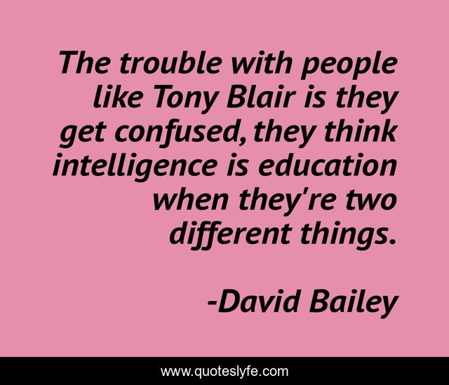 This page presents the quote "The trouble with people like Tony Blair is they get confused, they think intelligence is education when they're two different things.". Author of this quote is David Bailey. This quote is about education, confused, people,.