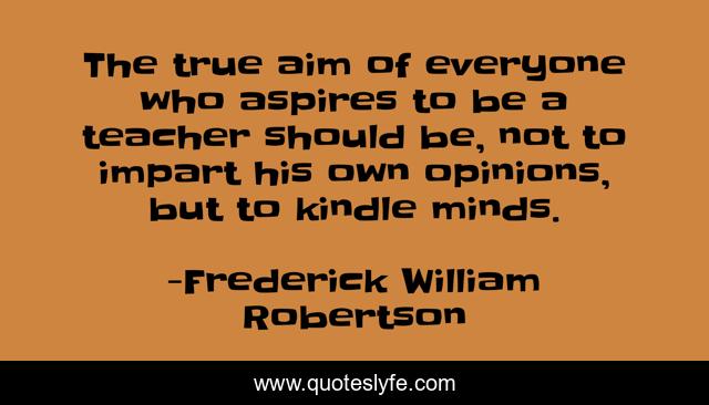 This page presents the quote "The true aim of everyone who aspires to be a teacher should be, not to impart his own opinions, but to kindle minds.". Author of this quote is Frederick William Robertson. This quote is about aim, opinions, true,.