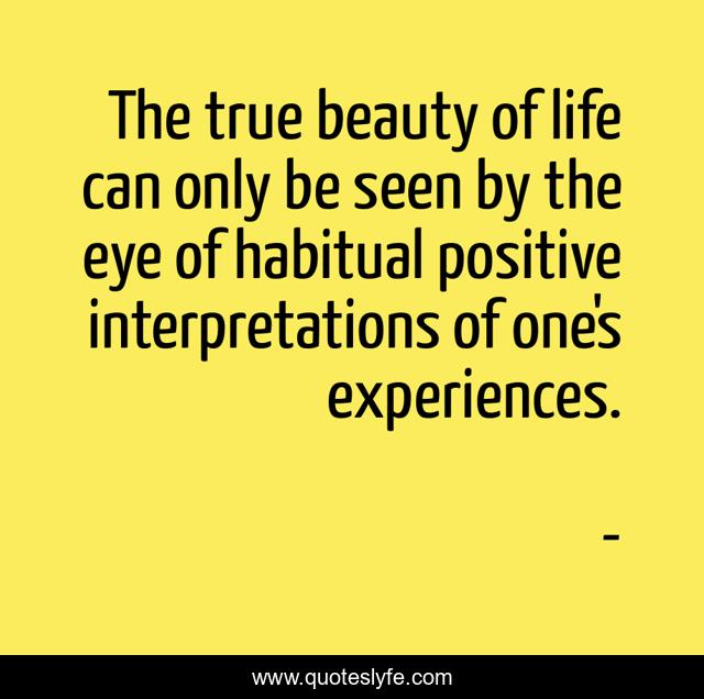 This page presents the quote "The true beauty of life can only be seen by the eye of habitual positive interpretations of one's experiences.". Author of this quote is . This quote is about the-beauty-of-life, positive-interpretations, edmond-mbiaka, habit, habitual, interpreting-life-positively, positive-interpretation, the-true-beauty-of-life, interpret,.