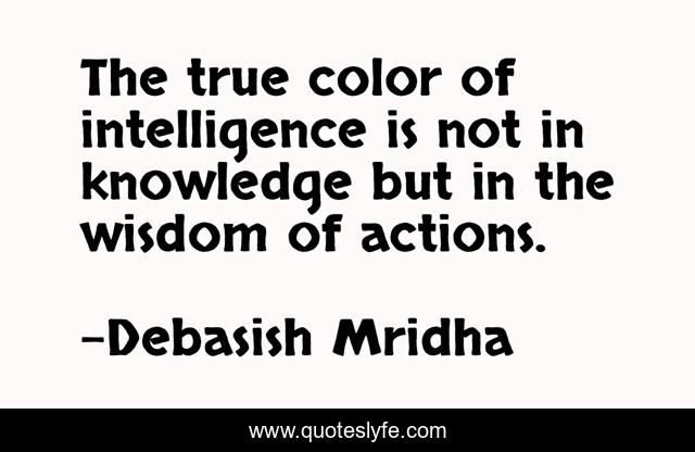 This page presents the quote "The true color of intelligence is not in knowledge but in the wisdom of actions.". Author of this quote is Debasish Mridha. This quote is about true-color, debasish, knowledge, intelligence, wisdom-of-actions, philosophy, debasish-mridha, actions, wisdom,.
