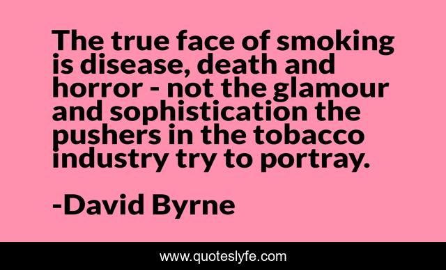 This page presents the quote "The true face of smoking is disease, death and horror - not the glamour and sophistication the pushers in the tobacco industry try to portray.". Author of this quote is David Byrne. This quote is about try, smoking, face,.