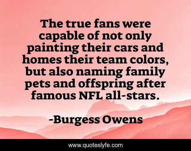 This page presents the quote "The true fans were capable of not only painting their cars and homes their team colors, but also naming family pets and offspring after famous NFL all-stars.". Author of this quote is Burgess Owens. This quote is about colors, family, team,.