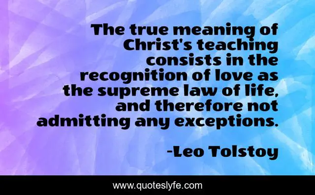 This page presents the quote "The true meaning of Christ's teaching consists in the recognition of love as the supreme law of life, and therefore not admitting any exceptions.". Author of this quote is Leo Tolstoy. This quote is about christian, religious, inspirational, enthusiasm,.