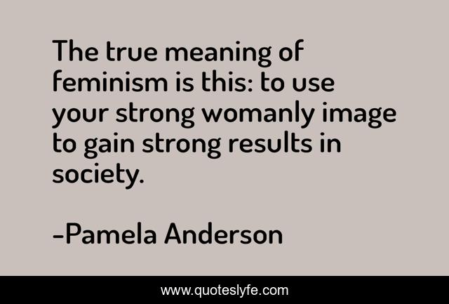 This page presents the quote "The true meaning of feminism is this: to use your strong womanly image to gain strong results in society.". Author of this quote is Pamela Anderson. This quote is about meaning, strong, true,.