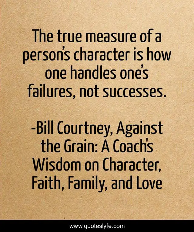This page presents the quote "The true measure of a person’s character is how one handles one’s failures, not successes.". Author of this quote is Bill Courtney, Against the Grain: A Coach's Wisdom on Character, Faith, Family, and Love. This quote is about handle, success, successes, character, person, measure, failures, true,.