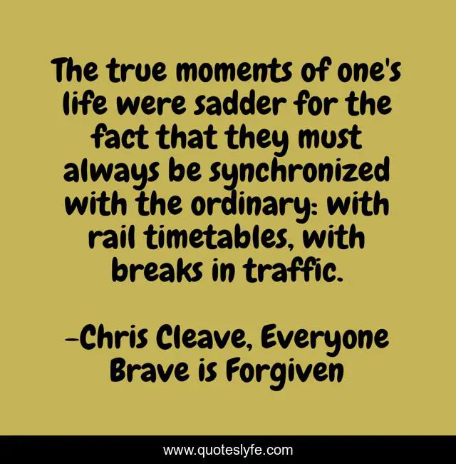 This page presents the quote "The true moments of one's life were sadder for the fact that they must always be synchronized with the ordinary: with rail timetables, with breaks in traffic.". Author of this quote is Chris Cleave, Everyone Brave is Forgiven. This quote is about sadness, time,.