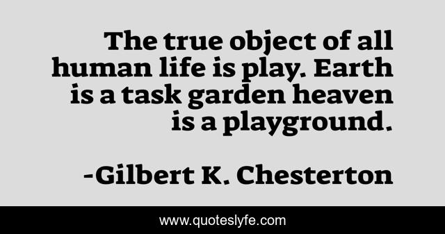 This page presents the quote "The true object of all human life is play. Earth is a task garden heaven is a playground.". Author of this quote is Gilbert K. Chesterton. This quote is about earth, play, garden,.