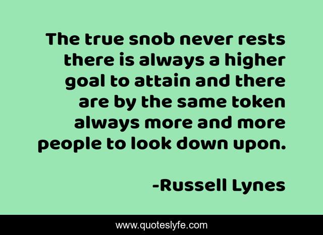This page presents the quote "The true snob never rests there is always a higher goal to attain and there are by the same token always more and more people to look down upon.". Author of this quote is Russell Lynes. This quote is about snobs, snobbishness,.